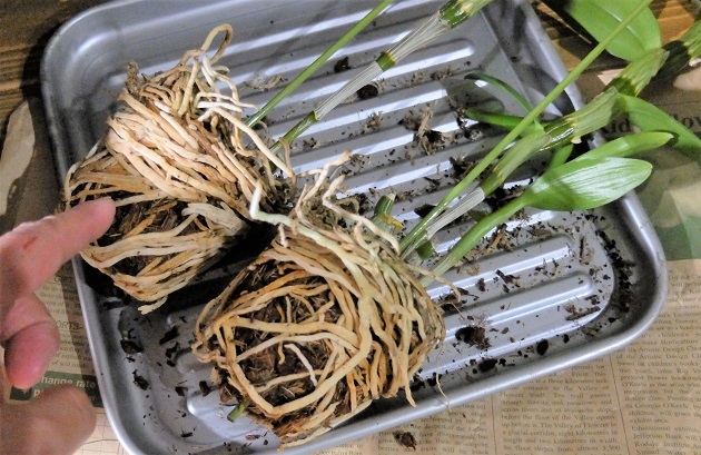 詰め込んであったけど根の状態はまあまあ。根を整理して新芽を一つ残し栄養を集中させて、後の芽は間引きます。