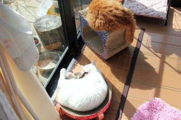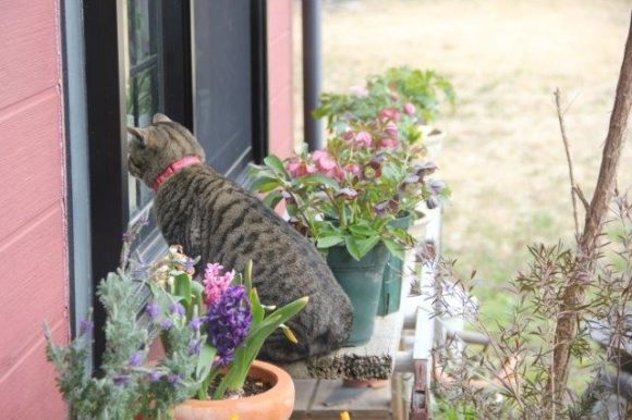 窓の外には、ちょうどいい具合に花台があり、その上に乗ってるんです