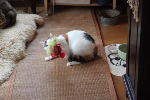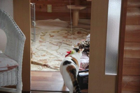 そういうわけで少しは激しい動きの制止になるかと、上から猫のおもちゃをひもでぶら下げてみました。やっぱりすぐに反応して、おもちゃに夢中になってます。