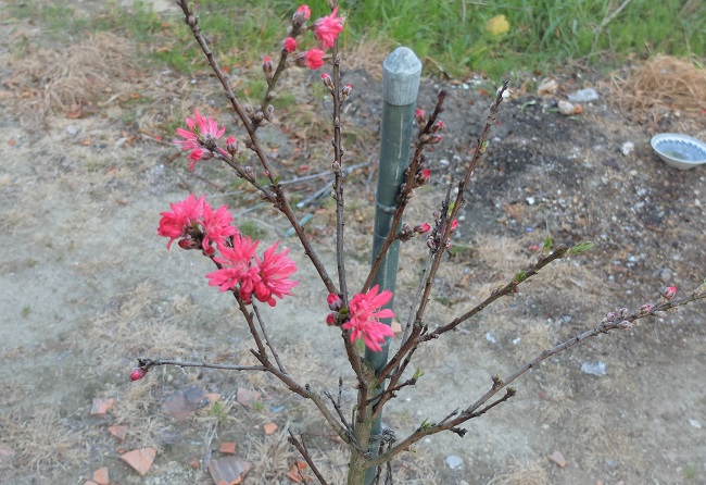 その他には去年春に植え付けた桃の木は背丈はのびてないけど、幹は太くなったかな。